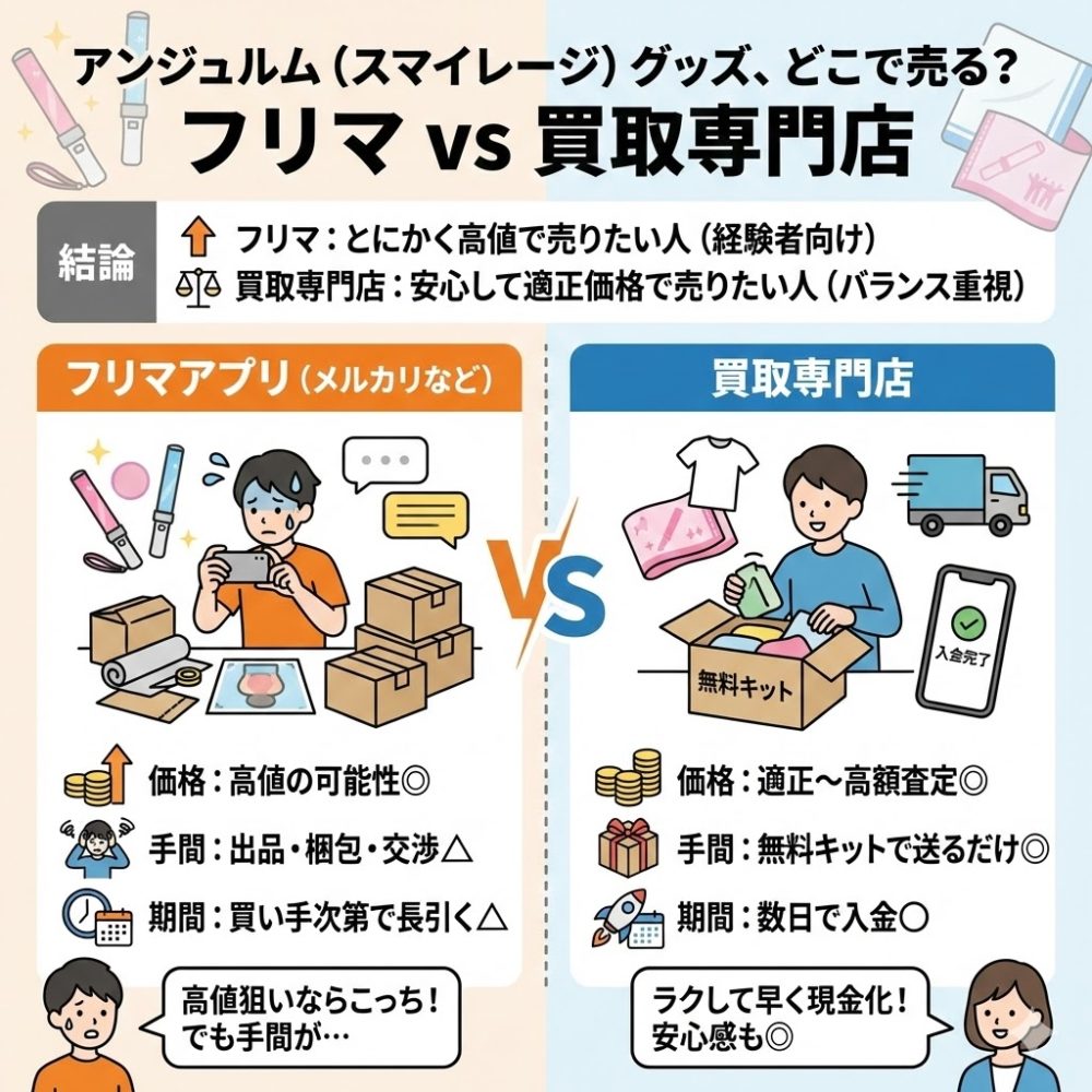 アンジュルムのグッズを売る方法はいくつかありますが、代表的なのが「フリマアプリ」と「買取専門店」です。
