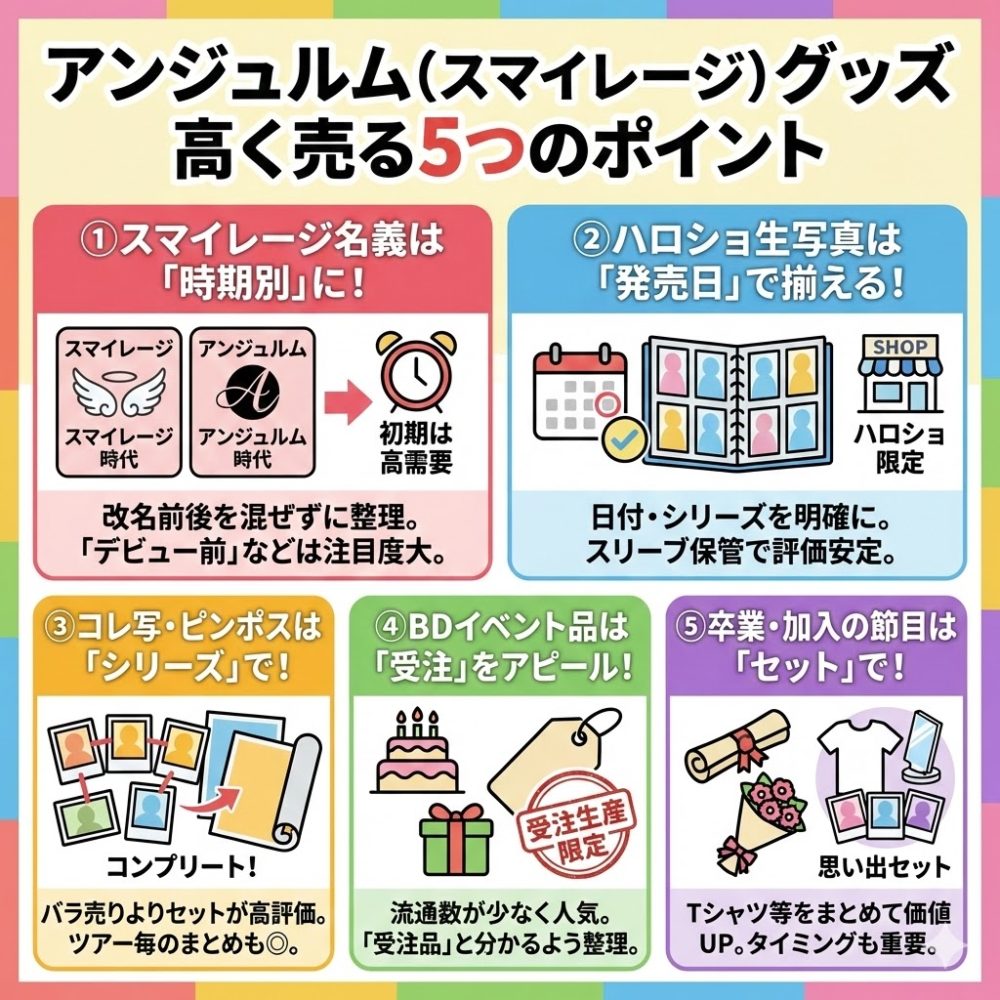 アンジュルムは旧グループ名「スマイレージ」時代のグッズも人気があります。改名前と改名後を混ぜず、時期ごとに分けて出すと価値が伝わりやすくなります。