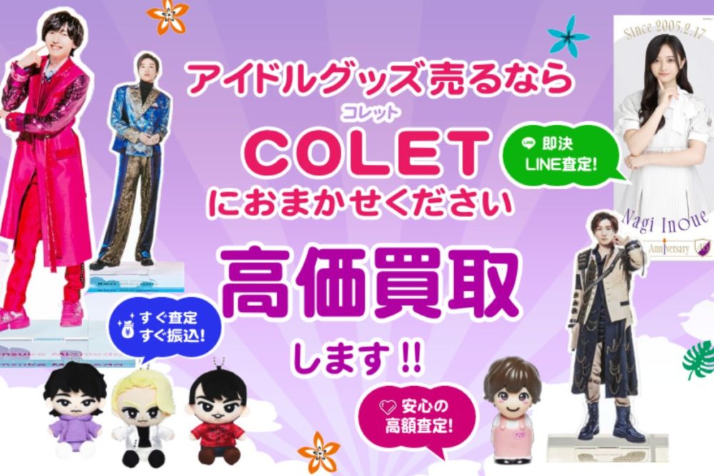 | COLET | 宅配・店舗 | LINE | なし | ・公式アイドルグッズ全般 ・生写真、サイン入りグッズ、限定品など高額買取 | 送料・査定料・振込手数料無料 | 査定は数日 |