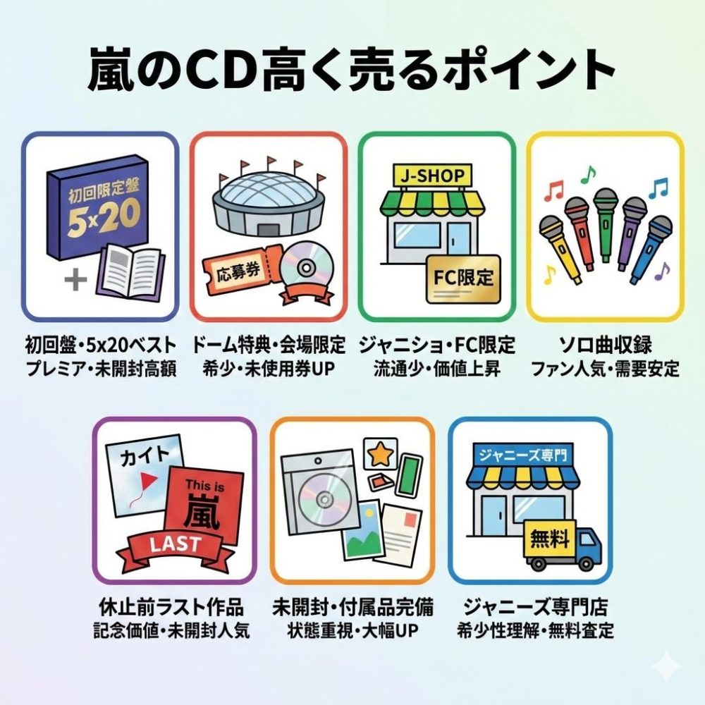 嵐のCDを高く売るためには、「どの商品に価値があるか」「状態はどうか」「どの業者を選ぶか」がポイントです。
