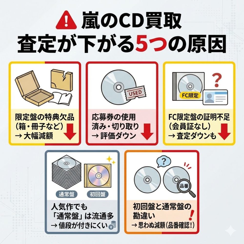 いくら嵐の人気が高くても、状態や内容によっては買取価格が下がってしまうことがあります。以下に代表的な原因を紹介します。