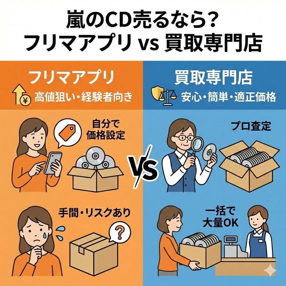 一方で買取専門店は、プロが査定してくれ、一括で大量に売れるのがメリット。最近はジャニーズ専門の買取業者も増えており、嵐のCDを高く買い取ってくれるケースもあります。