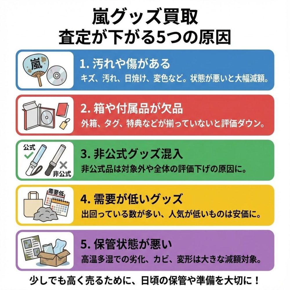 嵐グッズを売るとき、いくつかの理由で査定額が下がってしまうことがあります。ここではその代表的な原因について解説します。