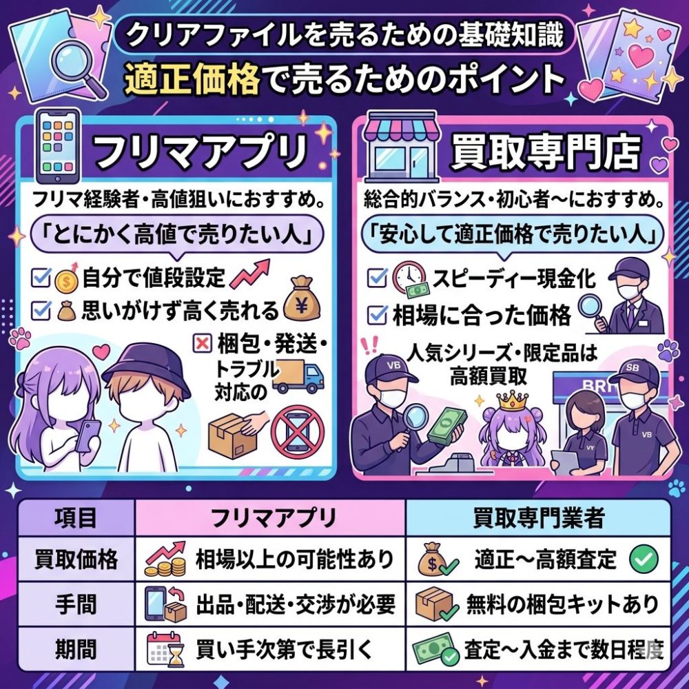 クリアファイルを売る方法はいくつかありますが、代表的なのが「フリマアプリ」と「買取専門店」です。