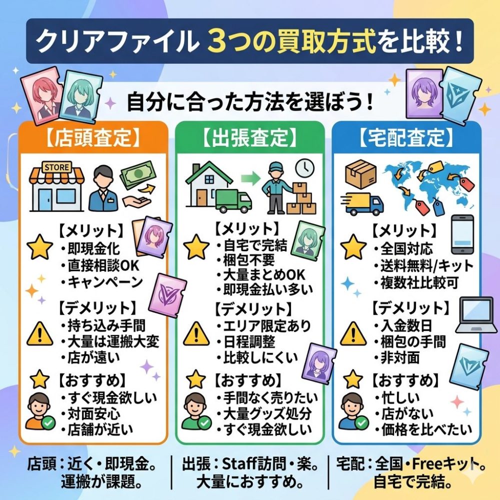 クリアファイルの買取方法には、主に「宅配査定」「出張査定」「店頭査定」3つがあります。それぞれの特徴を理解して、自分に合った方法を選びましょう。