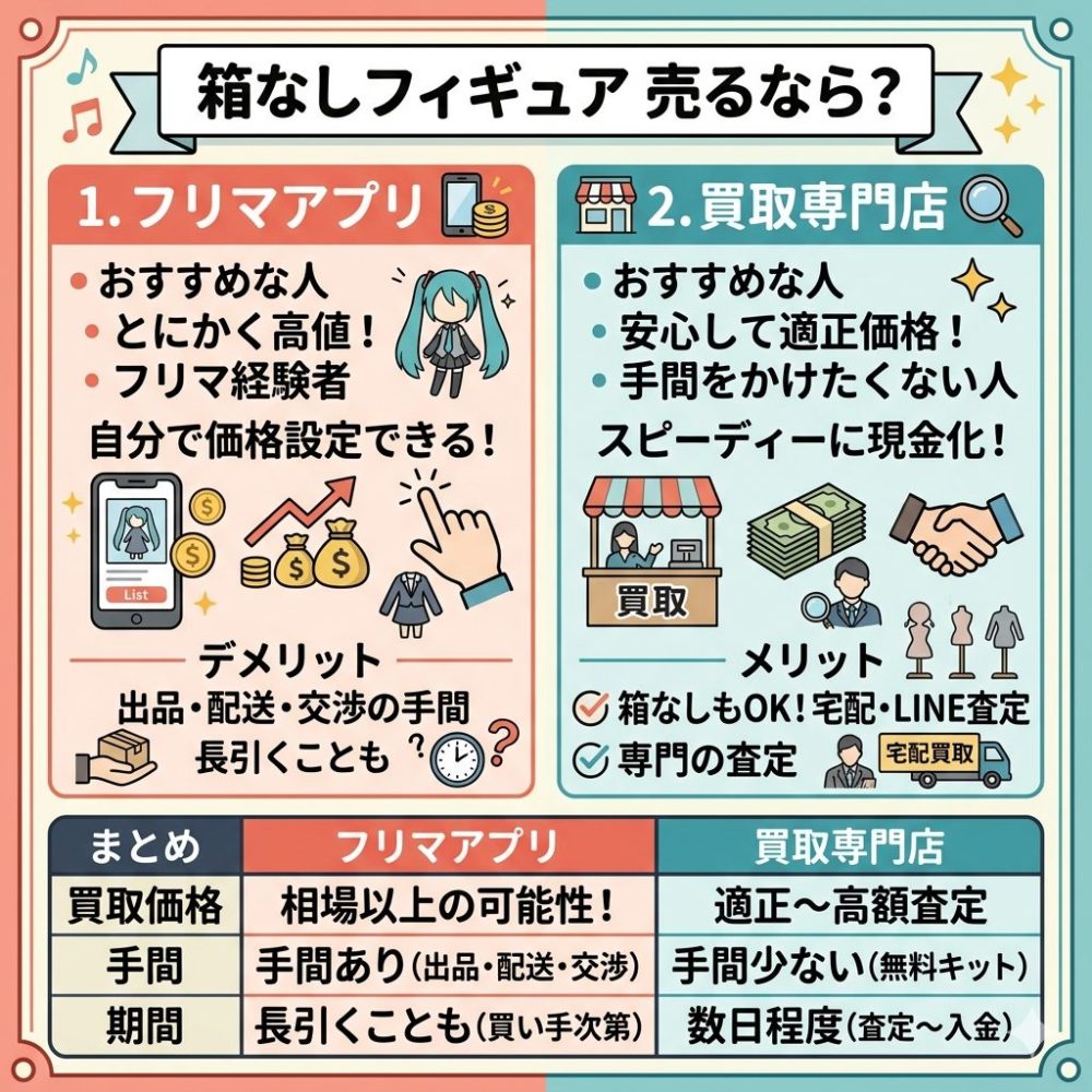 箱なしフィギュアを売る方法はいくつかありますが、代表的なのが「フリマアプリ」と「買取専門店」です。