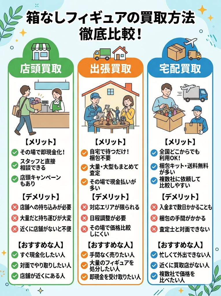 箱なしフィギュアの買取方法には、主に「宅配査定」「出張査定」「店頭査定」3つがあります。それぞれの特徴を理解して、自分に合った方法を選びましょう。