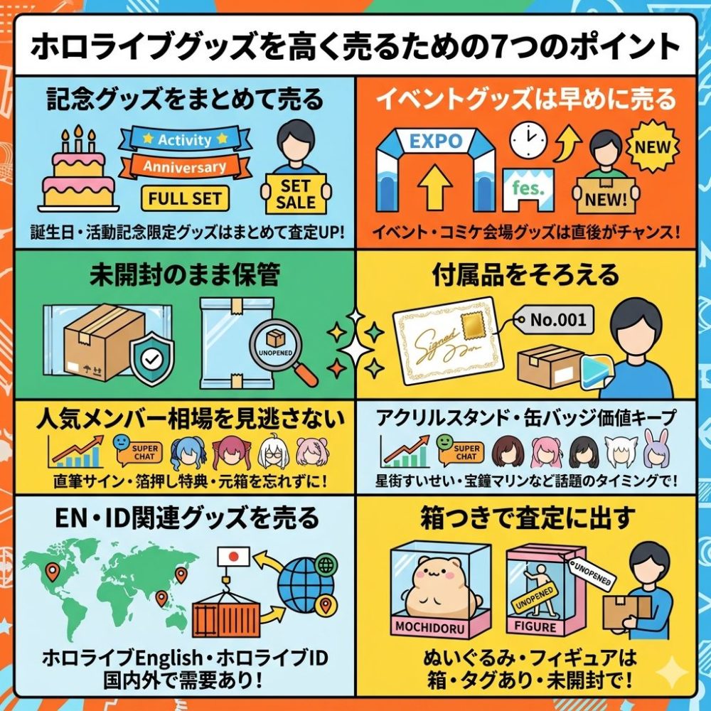 ホロライブグッズを高値で売るには、グッズの種類や状態、タイミングが重要です。以下のコツを押さえて、少しでも高く買い取ってもらいましょう。