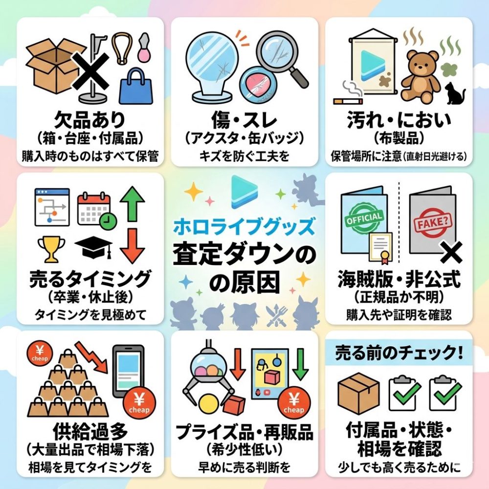 ここでは、ホロライブグッズを売る際に査定額が下がってしまう主な理由について解説します。売却前にチェックしておけば、損を避けることができます。