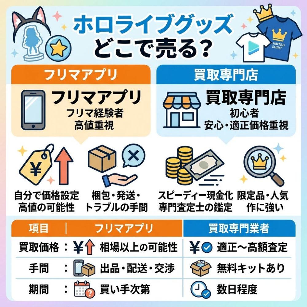 ホロライブグッズを売る方法はいくつかありますが、代表的なのが「フリマアプリ」と「買取専門店」です。