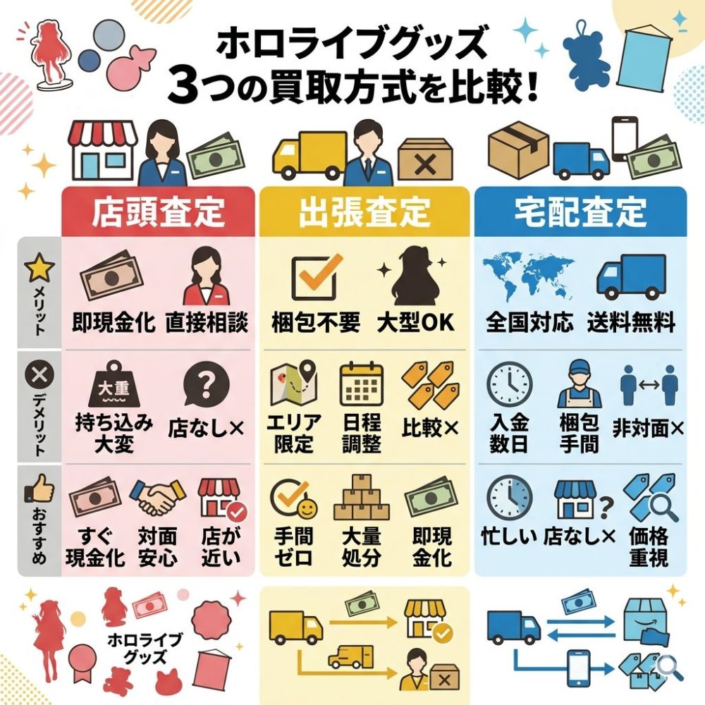 ホロライブグッズの買取方法には、主に「宅配査定」「出張査定」「店頭査定」3つがあります。それぞれの特徴を理解して、自分に合った方法を選びましょう。