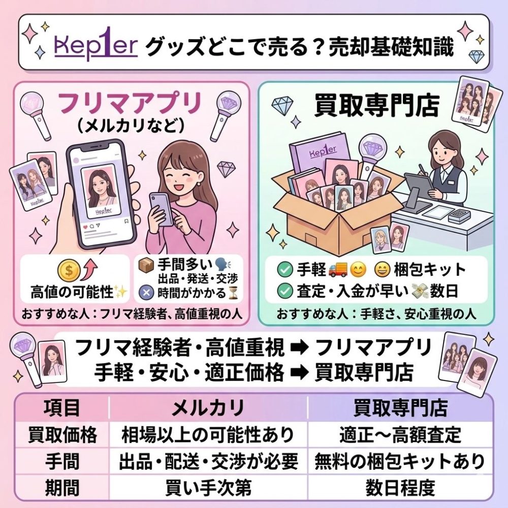 Kep1er(ケプラー)のグッズを売る方法はいくつかありますが、代表的なのが「フリマアプリ」と「買取専門店」です。