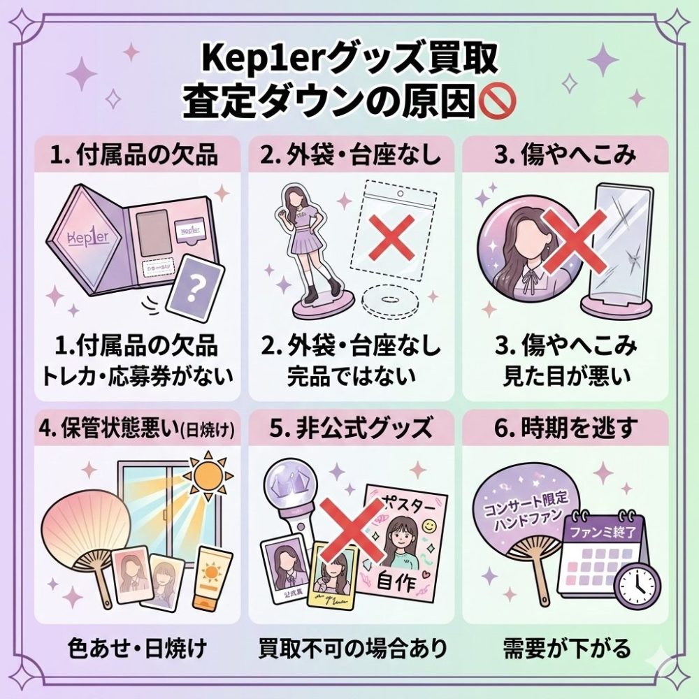 どんなに人気のあるKep1er(ケプラー)グッズでも、いくつかの理由で査定が下がってしまうことがあります。ここでは、査定が下がる原因を解説します。
