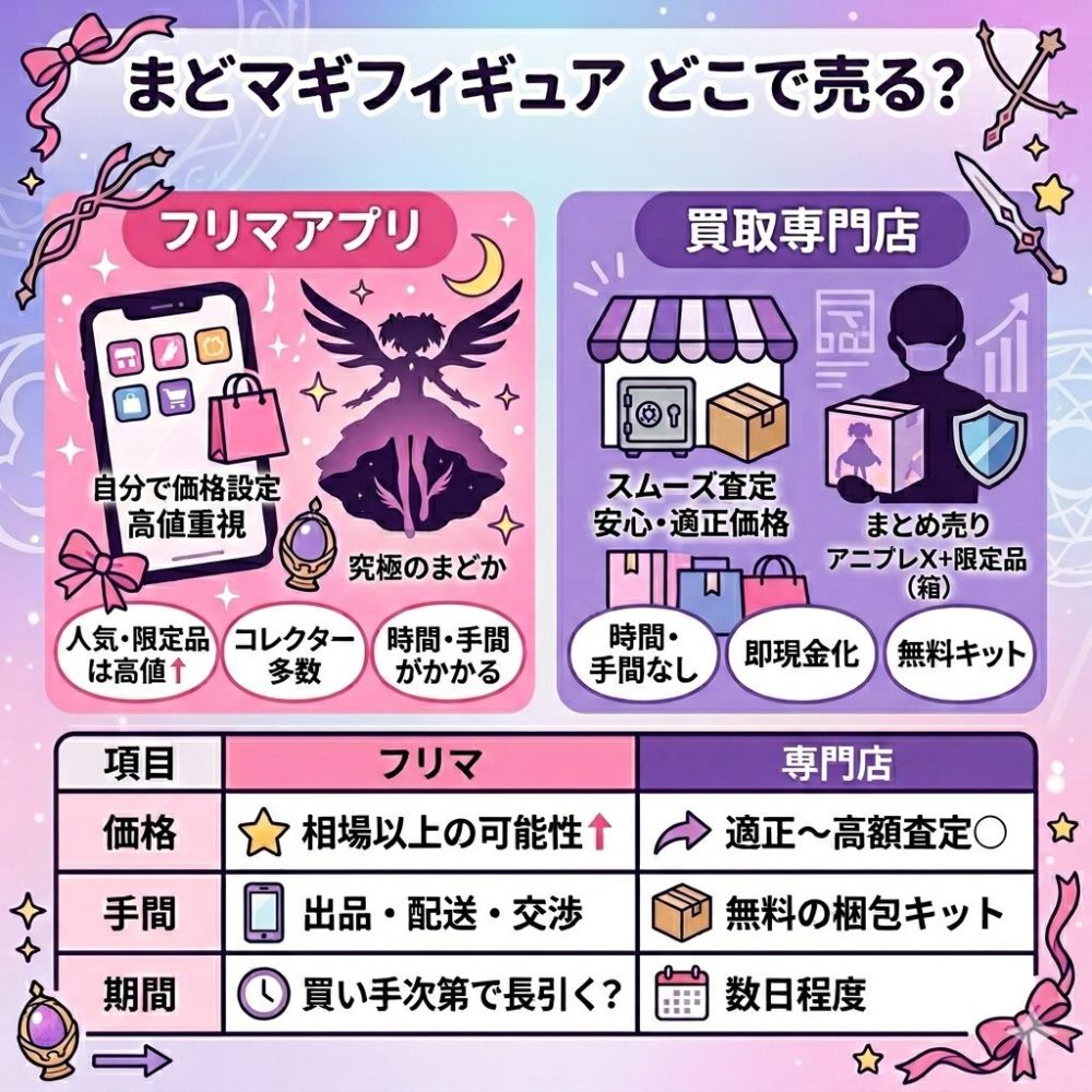 まどマギのフィギュアを売る方法はいくつかありますが、代表的なのが「フリマアプリ」と「買取専門店」です。