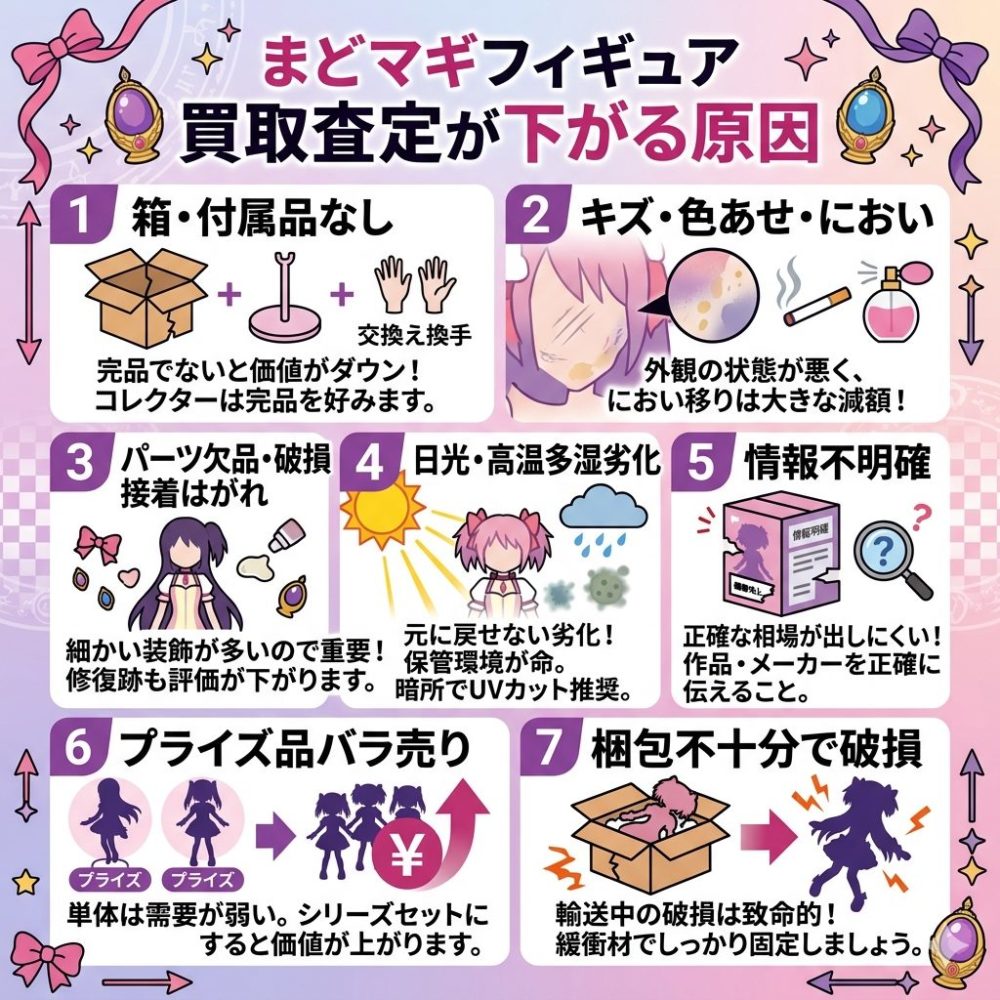 パーツの欠品や破損は大きな減額対象です。特に細かい装飾が多いまどマギフィギュアでは、パーツの有無が重要です。