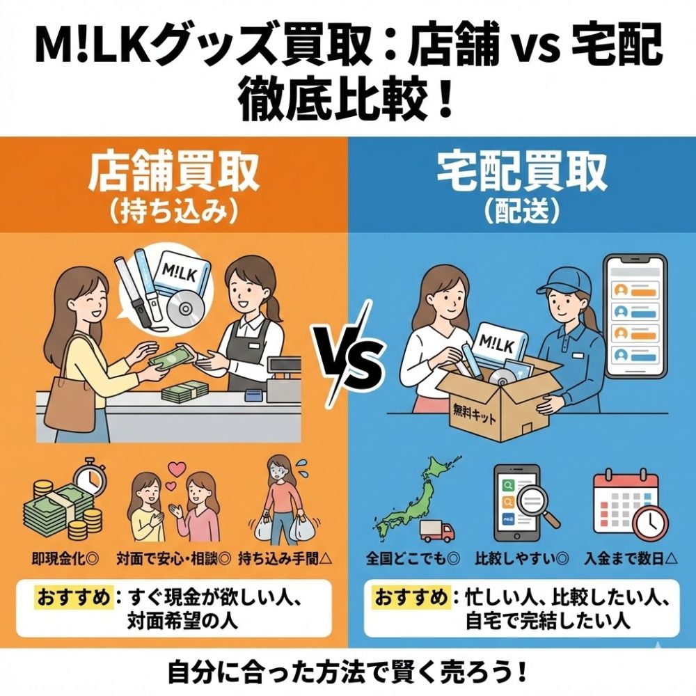 買取専門店でM!LK(ミルク)グッズを売る場合、「店舗買取」「宅配買取」があります。