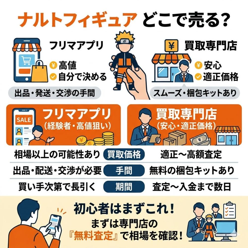 ナルトのフィギュアを売る方法はいくつかありますが、代表的なのが「フリマアプリ」と「買取専門店」です。