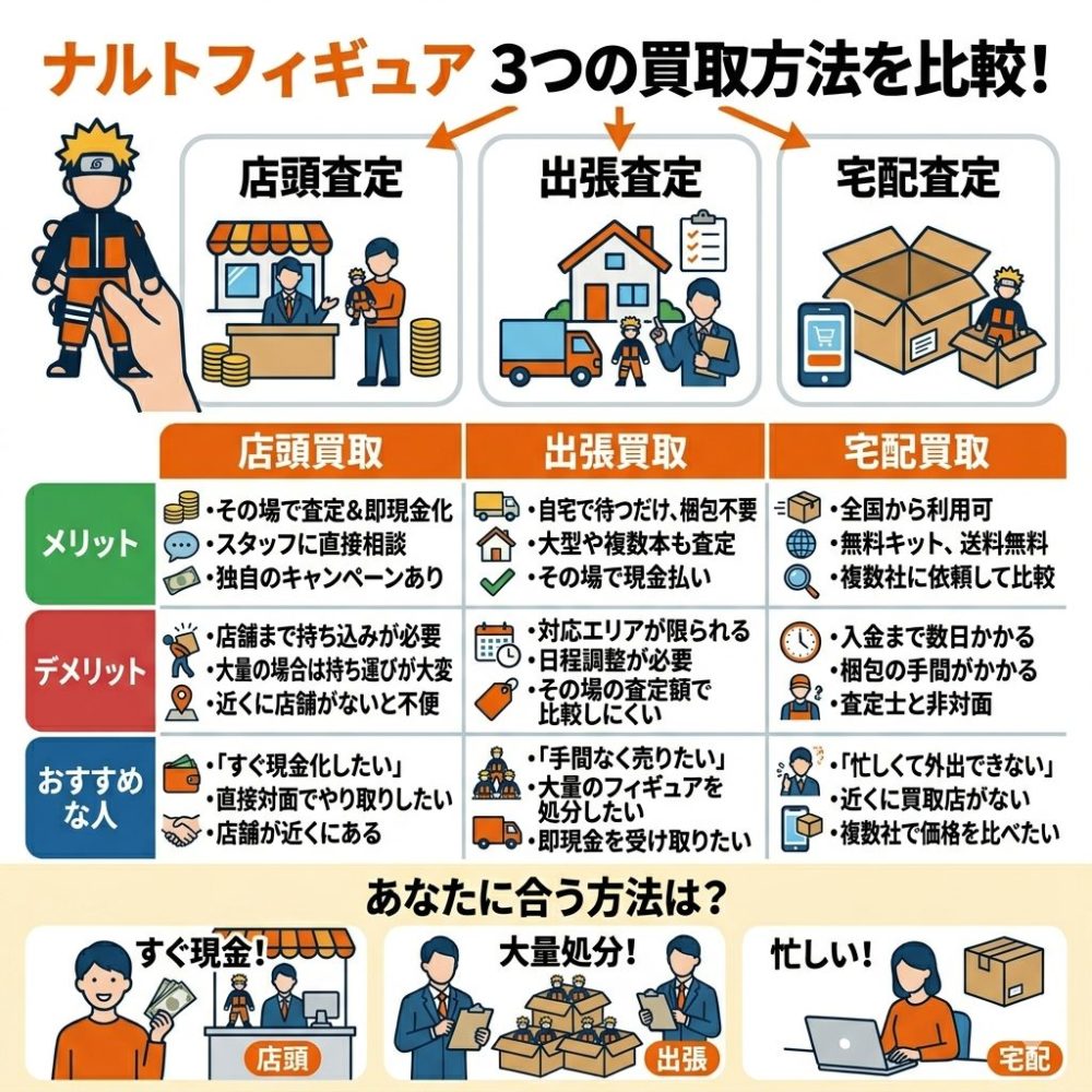 ナルトのフィギュア買取方法には、主に「宅配査定」「出張査定」「店頭査定」3つがあります。それぞれの特徴を理解して、自分に合った方法を選びましょう。