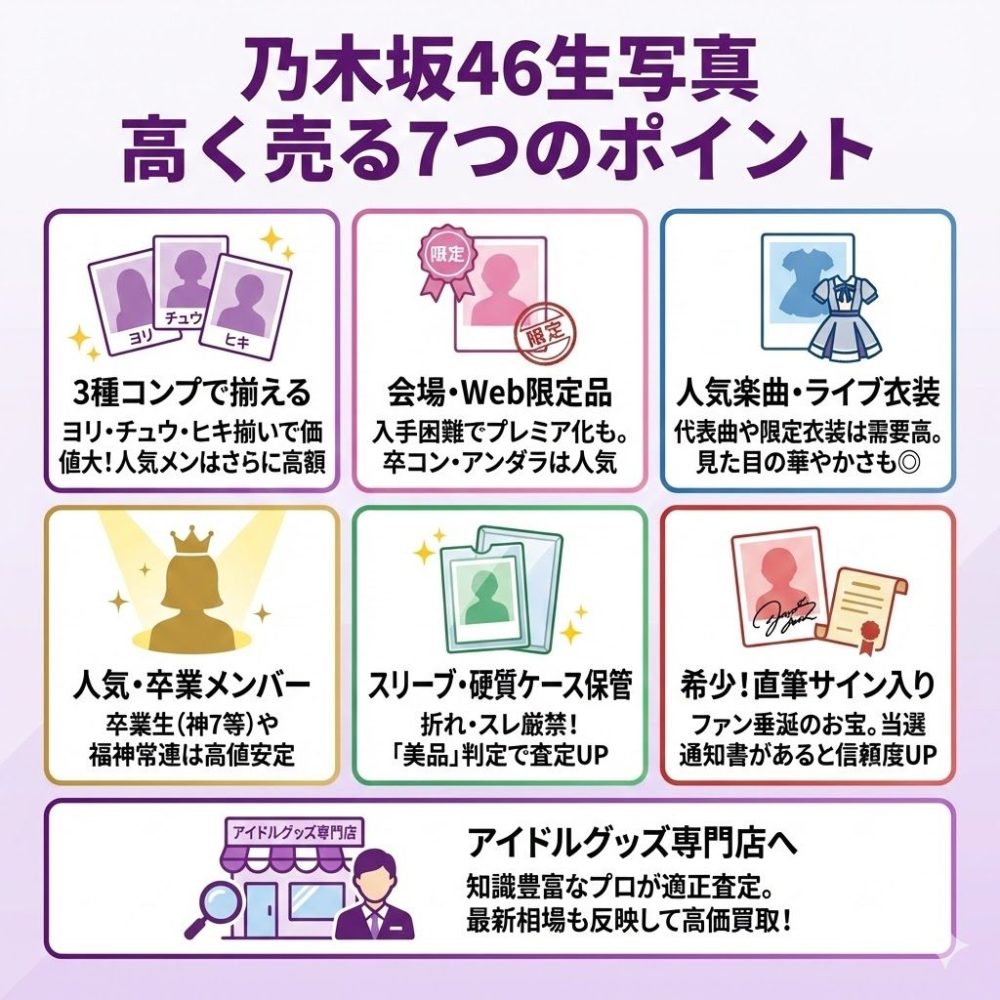 この記事では、乃木坂46の生写真を売りたい人のために、基礎知識から高く売るポイント、買取での注意点や疑問までをわかりやすく解説します。