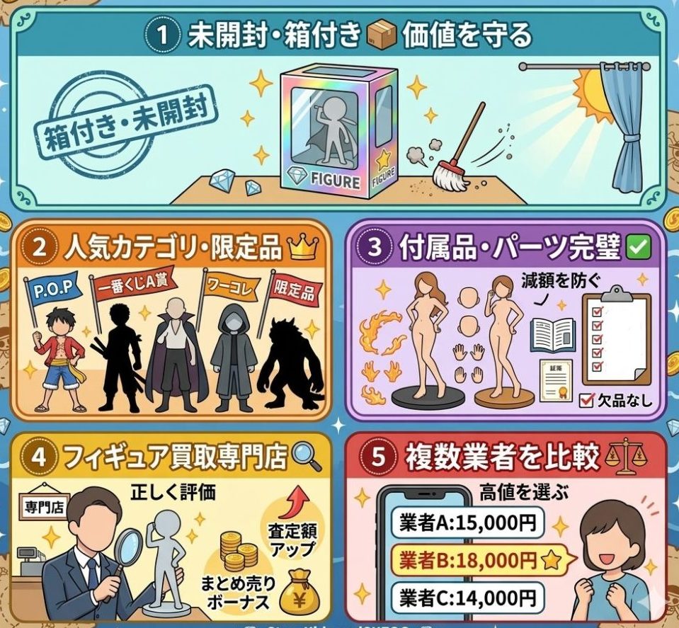 フィギュアは未開封・箱付きの状態が一番高く売れます。開封済みだと状態確認やパーツ欠品のリスクがあるため、買取価格が下がる傾向です。