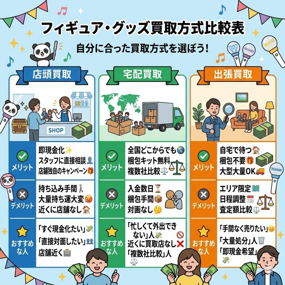 | おすすめな人 | ・「すぐ現金化したい」人 ・直接対面でやり取りしたい人 ・店舗が近くにある人 | ・「手間なく売りたい」人 ・大量のフィギュアを処分したい人 ・即現金を受け取りたい人 | ・「忙しくて外出できない」人 ・近くに買取店がない人 ・複数社で価格を比べたい人 |