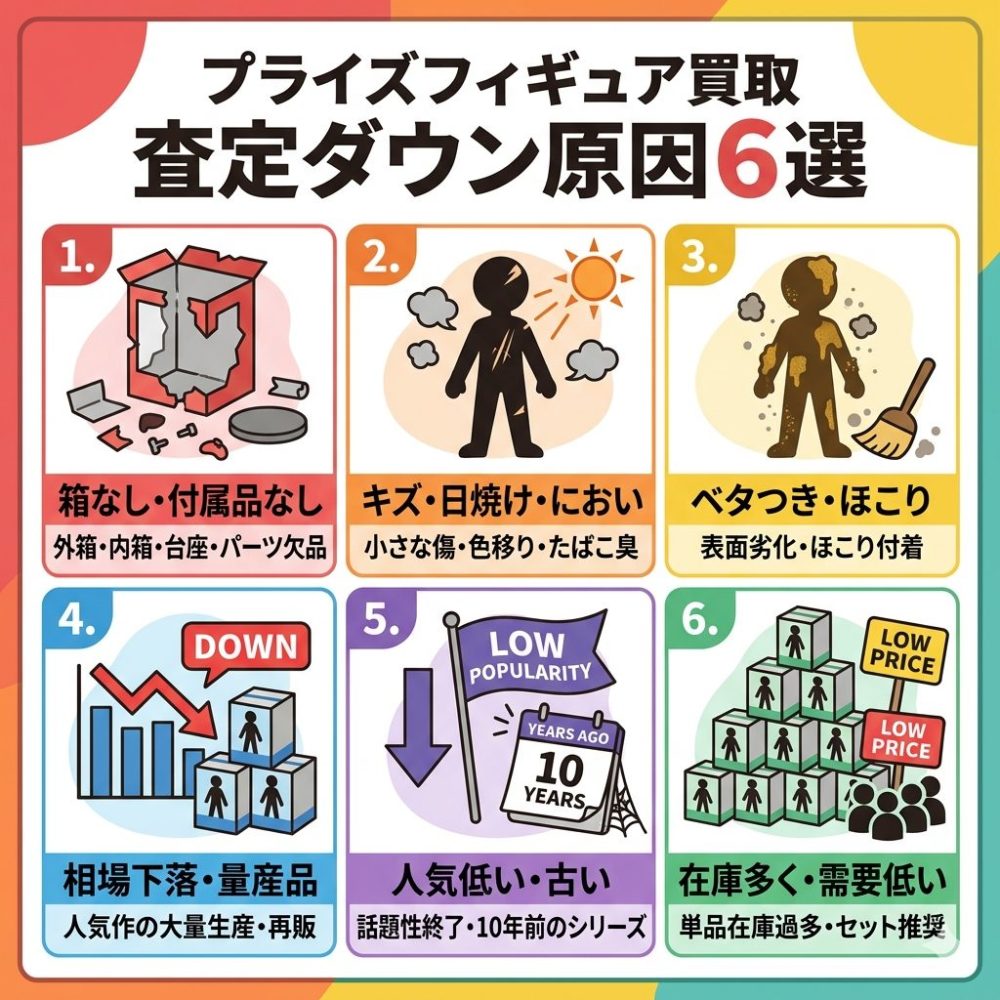 プライズフィギュアの査定価格は、保管状態や作品の人気、タイミングによって大きく変動します。ここでは査定が下がる主な理由を解説します。