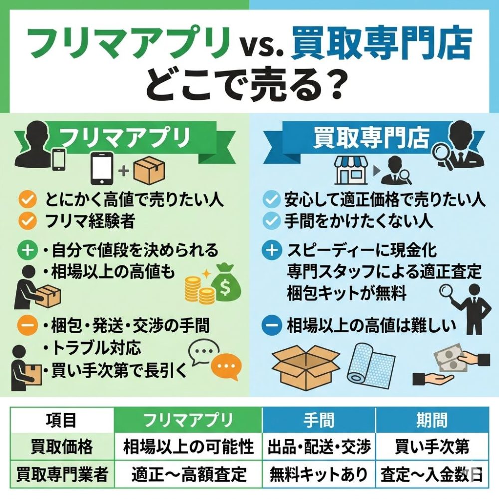 フリマアプリは自分で値段を決められ、思いがけず高く売れる場合もありますが、梱包・発送・トラブル対応の手間がかかります。