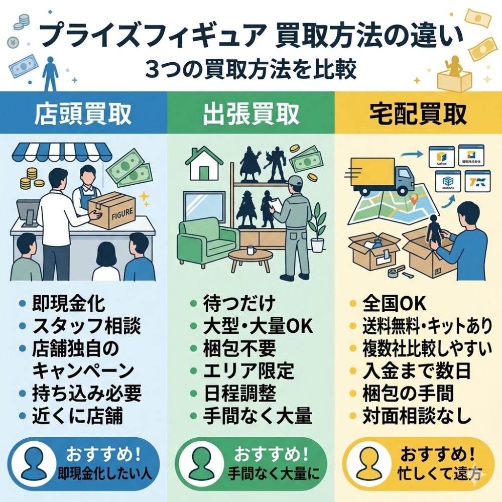 プライズフィギュアの買取方法には、主に「宅配査定」「出張査定」「店頭査定」3つがあります。それぞれの特徴を理解して、自分に合った方法を選びましょう。