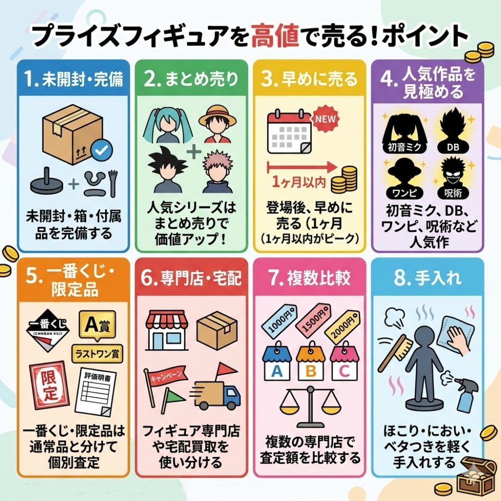 プライズフィギュアを高く売るためには、「売るタイミング」「状態の管理」「売り方の選択」が大切です。