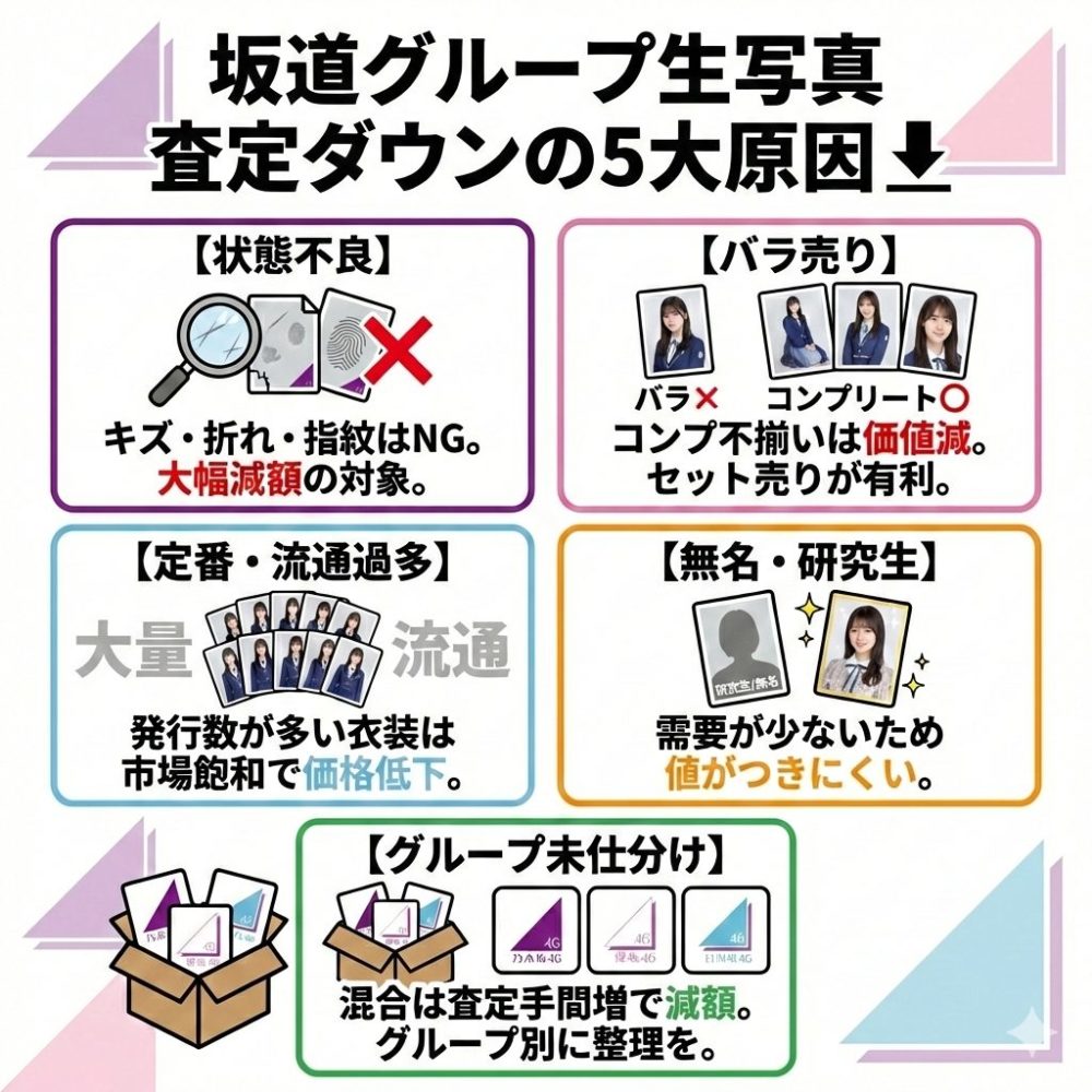 坂道グループ生写真の相場は、メンバーの人気度や種類によって大きく変わります。ここでは高く売るためのポイントを解説します。