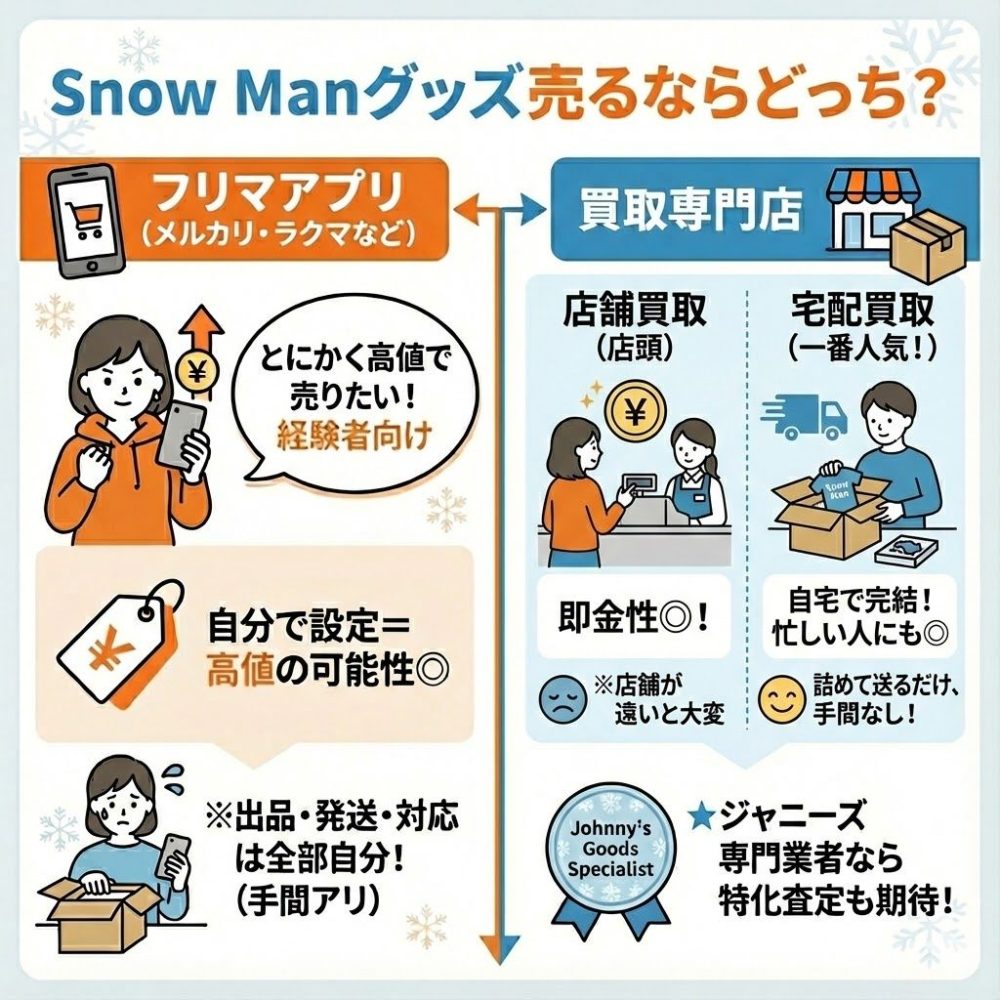 Snow Manのグッズを売る際には、「フリマアプリ(メルカリ、ラクマなど)」か「買取専門業者」のどちらかを選ぶのが一般的です。