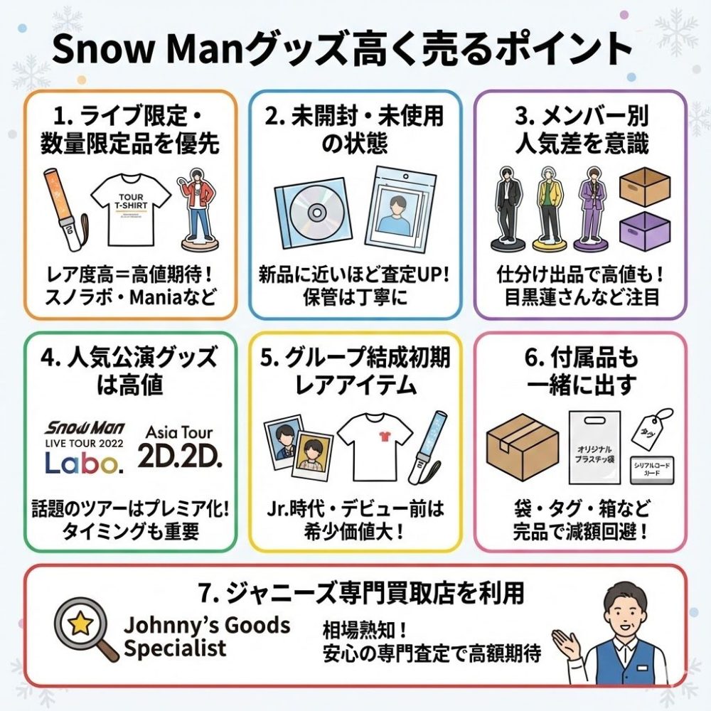 Snow Manのグッズを少しでも高く売りたいなら、以下のポイントを押さえておくことが重要です。ちょっとした工夫やタイミングで、数百円から数千円以上の差が出ることもあります。