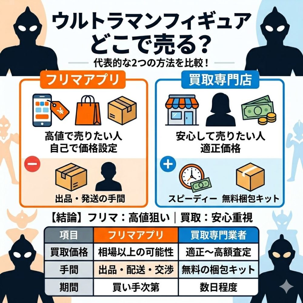 ウルトラマンのフィギュアを売る方法はいくつかありますが、代表的なのが「フリマアプリ」と「買取専門店」です。