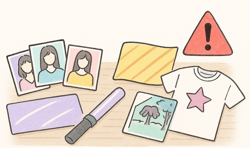 生写真は折れないように厚紙で補強し、衣類やペンライトはビニール袋に入れて防水対策をすると安心です。