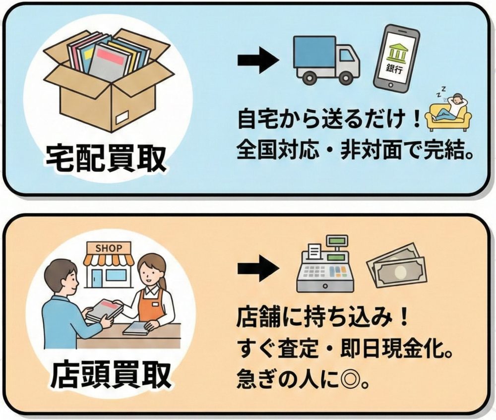 | デメリット | ・店舗まで持ち込みが必要 ・量が多いと持ち運びが大変 ・近くに店舗がないと不便 | ・入金まで数日かかることあり ・梱包の手間がかかる ・査定士と対面で話せない |