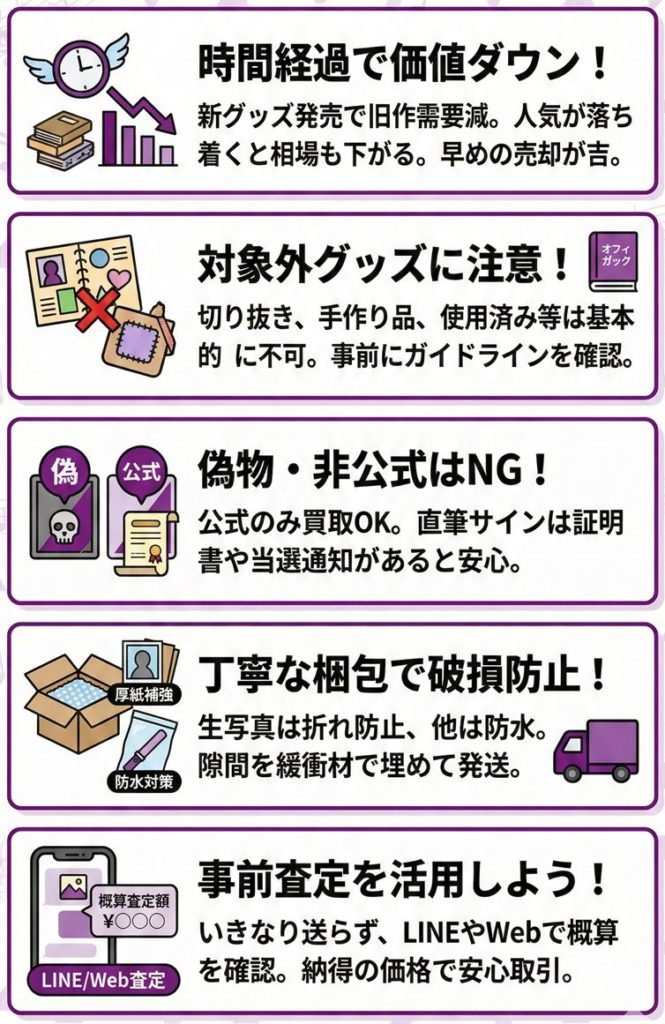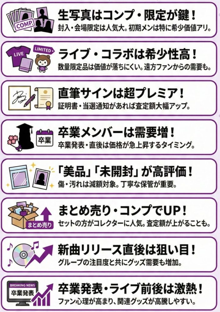 特典生写真や限定アイテムは特に人気が集中しやすいです。ファンが一気にグッズを探すため、査定額が上がる傾向があります。